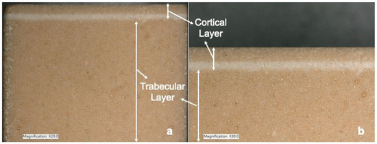 Illustrates the bi-layered custom polyurethane block with a top cortical layer and a trabecular layer at ×20.0 magnification (a) and ×30.0 magnification (b).