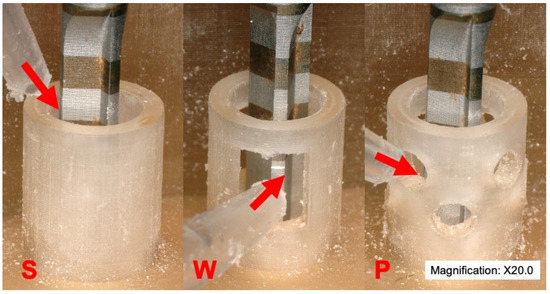 The coolant application is adapted to the type of cylinder. In the solid group, the coolant is directed from the top of the cylinder toward the top of the drill. In the group with windows, the coolant is directed through the window at the middle portion of the drill. Meanwhile, in the group with pores, the coolant was directed through the perforations in the middle of the drill. S (solid group), W (windows group), and P (pores group). The red arrows indicate the areas where the coolant is directed during the irrigation.