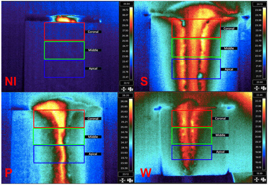 Thermal analysis was conducted using FLIR Research Studio (Teledyne FLIR, Wilsonville, OR, USA). Three rectangular regions of interest (ROIs) of 3 mm height and 5 mm width were drawn for temperature analysis at the coronal, middle, and apical areas (Figure 5 and Figure 6). A temporal plot was created to register the temperature over two minutes, and the maximum temperature (°C) was recorded for each region of interest.
