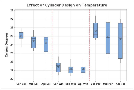 Box plot of the maximum temperatures registered at the coronal (Cor), middle (Mid), and apical (Api) areas. The vertical red dots divide the test groups. Win (Window), Sol (Solid), Por (Pores).