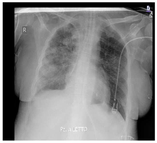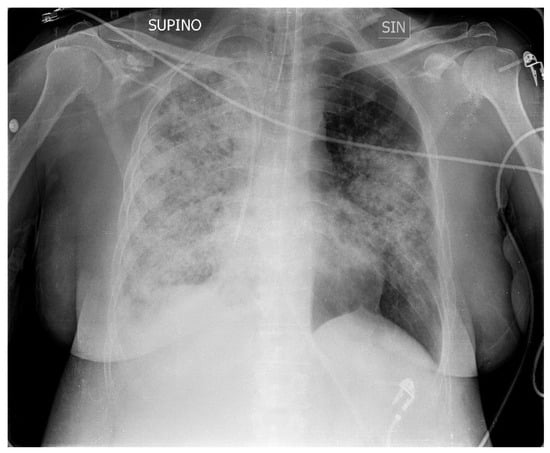 A 50-year-old patient with Down syndrome came to our ED with fever (38 °C), severe respiratory failure, tachypnea and dyspnea, an SpO2 of 82% with Venturi mask valves 15l/FiO2 60%, sinus tachycardia, blood pressure of 105/63 mmHg, and imaging of bilateral pneumonia in an X-ray of the chest, with greater involvement of the right lung (Figure 1). The patient came from the medical department of another hospital, and the symptoms had started about 10 days prior with a cough and low-grade fever. After seven days of home therapy with ceftriaxone and azithromycin for worsening symptoms, she was admitted to hospital with the diagnosis of bilateral interstitial pneumonia. Here, empiric therapy with meropenem, linezolid, and caspofungin was started, and supplemental oxygen was required.