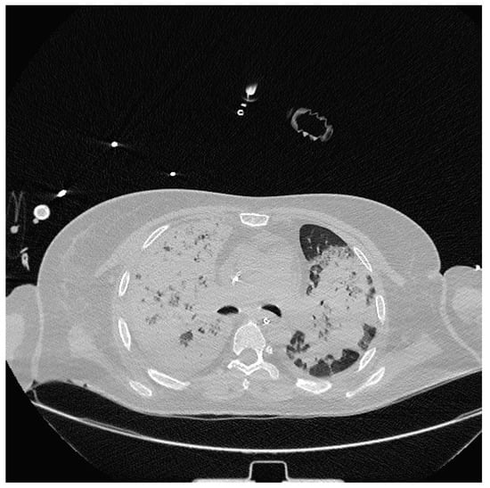 Severe hypoxia despite supplemental oxygen and respiratory distress required orotracheal intubation and mechanical ventilation in the emergency room. A chest CT scan was then performed, which showed extensive consolidation of the right lung and subtotal consolidation of the left lung (Figure 2).