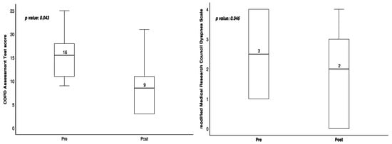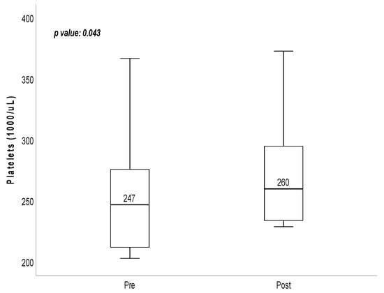 Patients 2, 3, 4, 5, and 6 demonstrated improvements in CAT scores following hydrogen gas inhalation intervention, and patients 2, 4, 5, and 6 also exhibited improvements in mMRC scores after the intervention (Table 1). Statistically, this study demonstrated significant improvements in CAT [15.5 (10.5–19.75) vs. 8.5 (3–13.5); p = 0.043] and mMRC scores [2.5 (1–4) vs. 2 (0–3.25); p = 0.046] before and after hydrogen gas inhalation, respectively (Table 2, Figure 1). However, no significant differences were observed in lung function, DLCO, sleep quality, and 6 MWT before and after hydrogen therapy (Table 1). CBC examination revealed a significant difference in platelet count before and after treatment [247 (209.75–298.75) vs. 260 (232.75–314.5); p = 0.043] (Table 3, Figure 2), respectively, while other blood tests, inflammation markers, and oxidative stress markers did not show significant differences before and after hydrogen therapy (Table 3).