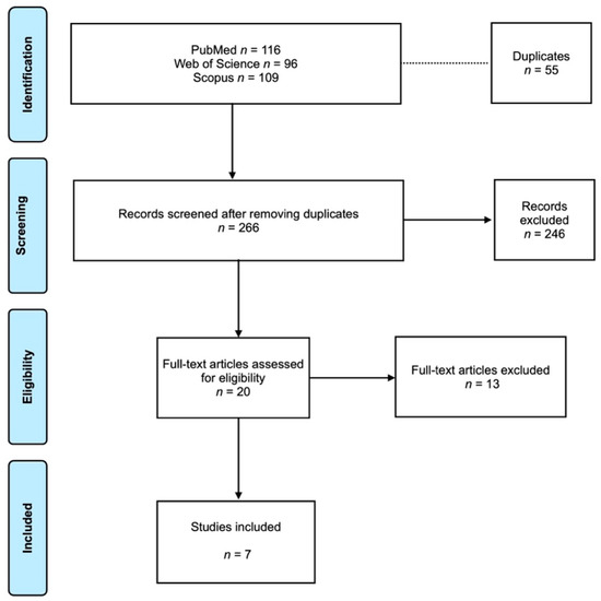 A total of 321 articles were retrieved from the selected electronic databases (PubMed, 116; Web of Science, 96; Scopus, 109). After removing the duplicates, a total of 266 articles were screened through title and abstract. In the next step, the full texts of 20 articles were assessed, and 7 articles were included in this review [15,16,17,18,19,20,21]. The flow diagram according to the PRISMA guidelines is presented in Figure 1, and the reasons for article exclusion are shown in Table 1. The coefficient of Cohen’s “K” for inter-reviewer agreement was 0.95.