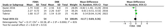 Forest plot showing bone volume for FDBA and DBB 6–9 months after sinus lift [16,18,19].