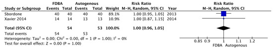 Forest plot showing the implant survival rate for FDBA and autogenous bone 6–12 months after implant placement [20,21].