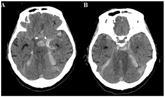 (A,B) Cranial computed tomography with contrast enhancement. Diffuse subarachnoid hemorrhage was noted.