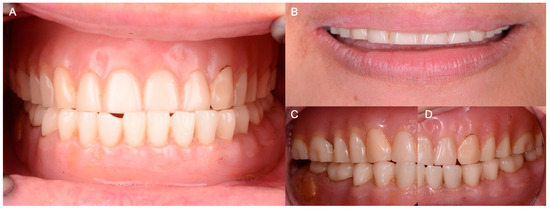Initial complete dentures. (A) Occlusion frontal view; (B) smile; (C) right side view; (D) left side view.