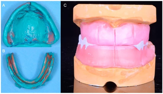 Final impressions and maxillomandibular relationship records. (A) Maxillary final impression using patient’s maxillary complete denture as a customized impression tray; (B) mandibular final impression; (C) master casts related using maxillo-mandibular relationship records.