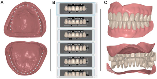 Digital design of the complete dentures. (A) Tooth location for maxilla and mandible; (B) selecting tooth shape; (C) digital tooth arrangement for the dentures.