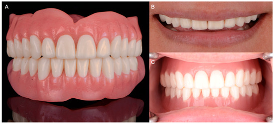 Final milled complete dentures. (A) Frontal view of maxillary and mandibular milled complete dentures; (B) patient smiling with dentures; (C) maxillary and mandibular complete dentures in centric occlusion.
