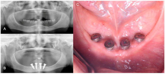 Before and after implant placement radiographs and clinical photograph. (A) Initial panoramic radiograph; (B) panoramic radiograph after implant placement; (C) occlusal view of mandibular implants.