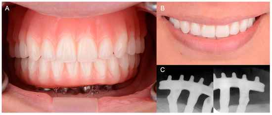 Final prostheses. (A) Frontal view of final maxillary complete denture and fixed mandibular complete denture; (B) smile with the final maxillary and mandibular prostheses; (C) periapical radiographs of the mandibular implants and implant superstructure on the day of delivery.