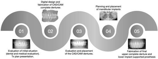 A combination of analog and CAD-CAM techniques were used to attain precision in the final milled maxillary and mandibular prostheses in an uncomplicated fashion and with a reduced number of appointments. Initially, the first analog impressions were obtained using the existing complete dentures as customized impression trays. Subsequently, the digital planning of the implant positions was defined using the contours of the first set of milled prostheses as a reference. A flowchart of the workflow performed for this treatment can be seen in Figure 8.
