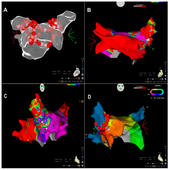 At the start of the procedure, an AT with a cycle length of 300 ms was present. Upon placement of the decapolar catheter into the coronary sinus, a double transseptal puncture was performed, guided by intracardiac echocardiography. The LA was mapped using a PentaRay multielectrode mapping catheter (CARTO3 Biosense Webster Inc., DiamondBar, CA, USA), and the ablation was performed with an irrigated contact force ablation catheter (THERMOCOOL SMARTTOUCH, Biosense Webster Inc., DiamondBar, CA, USA). The voltage map and signals documented the successful isolation of all veins except the Right Superior Pulmonary Vein (RSPV). An activation map generated by employing the Coherent module highlights the earliest activation zone in the anterior and superior antral region of the RSPV, representing the supposed gap in the place of the previous ablation. An integration image of the CT scan with the 3D electroanatomical map is depicted in Figure 3.
