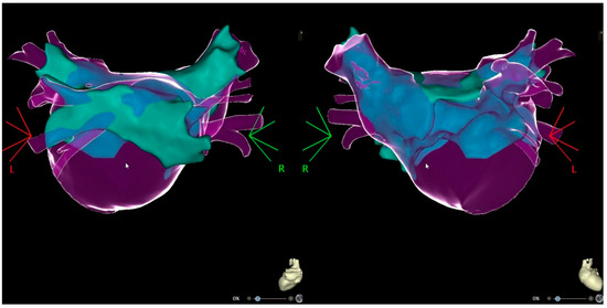 Integrated images CT scan with 3D electroanatomic map ((Left)—PA view; (Right)—AP view).