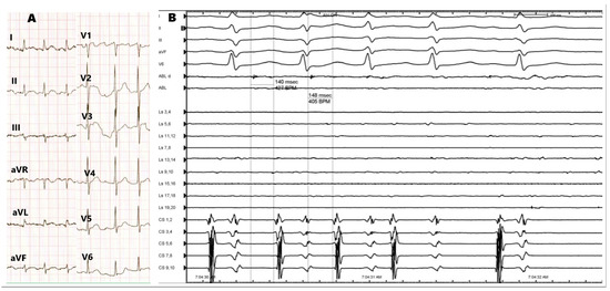 (A) Atrial tachycardia on the standard 12-lead ECG. (B) Electrograms during termination of atrial tachycardia.
