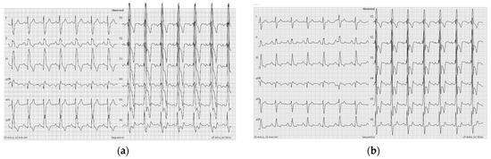 ECG showing right ventricle hypertrophy and RV overload signs ((a)—ECG 2 months before recent visit and (b)—ECG at recent visit).