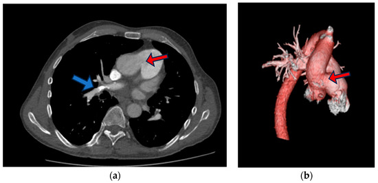 Chest CT (a) slide that shows aortopulmonic window (red arrow), right upper lobe anterior segment sub-segmental branches with small filling defects with adjacent calcification (blue arrow), (b) three-dimensional (3D) reconstruction of contrast-enhanced CT angiography images of the thoracic aorta and pulmonary artery trunk showing aortopulmonic window (red arrow).