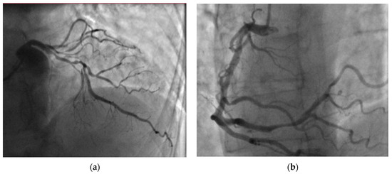 Following the exclusion of PE, coronary artery angiography (CA) was performed to investigate the possibility of external compression of the left coronary ostium due to a dilated pulmonary trunk. However, CA revealed a two-vessel CAD with the following CA stenoses: S3—75, S4—100, S6—75, S7—75, S9—90%) (Figure 4). After receiving a loading dose of two antiplatelet agents, the patient underwent a successful percutaneous coronary intervention (PCI) on segments S6, S7, and S8 with 2 drug-eluting stents (40- and 24-mm length).