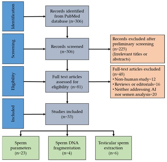 A total of 306 papers were identified after a thorough literature evaluation using PubMed database search. Eighty-one publications were selected after initial screening; these included various AI applications used to evaluate semen parameters. The evaluation of the full texts resulted in the exclusion of another 48 publications, with a final inclusion of 33 original articles in this systematic review (Figure 1, Supplementary Table S1).