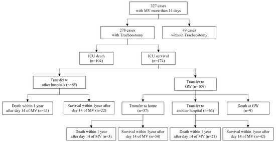 The study enrolled adult patients (≥18 years) admitted to the respiratory ICU between 1 February 2011, and 31 January 2021. Inclusion criteria encompassed patients receiving mechanical ventilation (MV) for over 14 days post-endotracheal intubation and undergoing a tracheostomy within the initial 14 days of MV [7,12,13]. Tracheostomy decisions were made by physicians for patients anticipated to require prolonged mechanical ventilation. Excluded from the study were individuals with pre-existing chronic conditions requiring invasive mechanical ventilation prior to ICU admission, those under the age of 18, and patients with irreversible brain injury, neuromuscular disorders, or inadequate medical documentation. This stringent and thorough patient selection process aimed to enhance the study’s internal validity and ensure a more homogeneous study population, contributing to the robustness of the findings and their applicability to similar clinical settings.