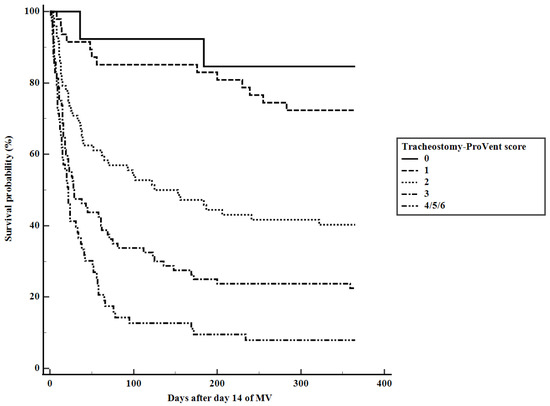 Kaplan–Meier survival curves of patients stratified according to tracheostomy-ProVent scores (Log-rank p-value < 0.001).