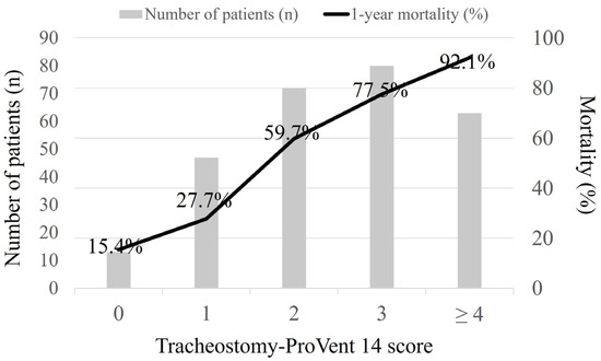 Numbers of patients sorted by tracheostomy-ProVent scores and their corresponding 1-year mortality rates.