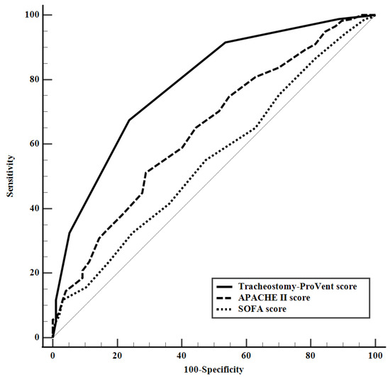 Comparison of receiver-operating characteristic curves (ROCs) for the ability of tracheostomy-ProVent scores (AUC 0.786, 95% CI 0.733–0.833), Acute Physiology and Chronic Health Evaluation (APACHE) II scores (AUC 0.644, 95% CI 0.5843–0.701), and Sequential Organ Failure Assessment (SOFA) scores (AUC 0.553, 95% CI 0.492–0.613) to predict 1-year mortality. Tracheostomy-ProVent scores demonstrated a significant superiority over both APACHE II (p = 0.0003) and SOFA scores (p < 0.0001).