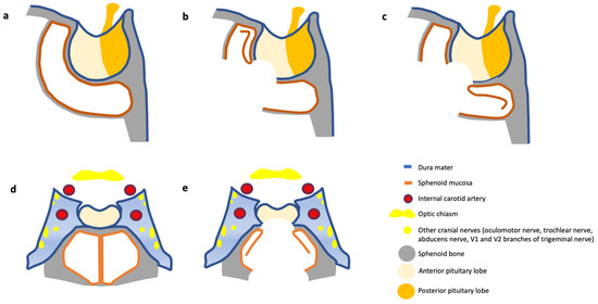 Illustration of different sphenoid mucosal flaps. (a,d) Normal preoperative sphenoid and sellar anatomy. (b) Superiorly and (c) inferiorly based mucosal flaps. (e) The most common intersinus septal mucosal flap.