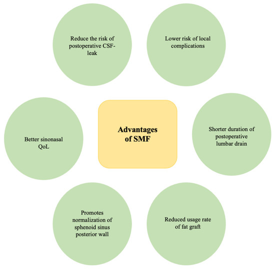 When compared to partial or no SMF covering, total SMF covering in sellar floor reconstruction resulted in fewer postoperative CSF leaks (p = 0.008) and a shorter duration of the postoperative lumbar drain (p = 0.003) [28]. Total or partial SMF resulted in fewer local complications (p = 0.012), such as fat graft necrosis, bone graft necrosis, sinusitis or fungal infection, in contrast to no SMF implementation [28]. Application of SMF may also reduce the usage of fat grafts and the risk of associated necrosis [21,28]. SMF also promotes the normalization of the sphenoid sinus posterior wall [26]. Sellar reconstruction with SMF results in a better sinonasal QoL compared to NSF, as measured by the SNOT-22 Score for the first 6 weeks postoperatively (p < 0.05) [22]. The advantages of SMF are presented in Figure 3.