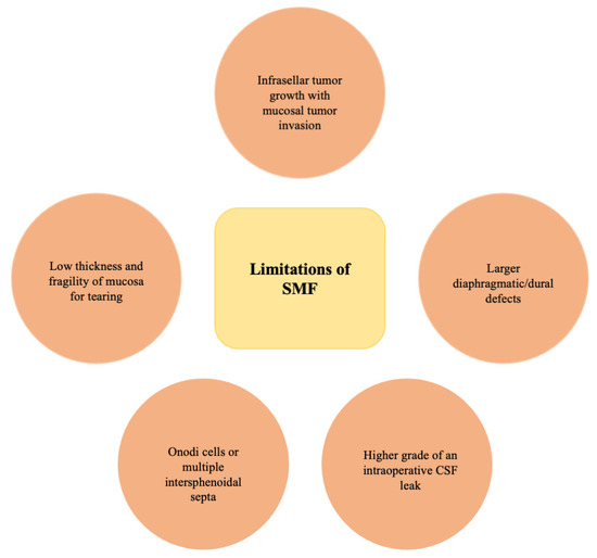 The anatomy of sphenoid sinus and sphenoid mucosa is variable and may limit the application of SMF. Mucosal thickness may vary from being very dense and elastic, suitable for dura and bone defect reconstruction, to being skinny and fragile, susceptible to tearing by bony ridges of the sphenoid sinus or any surgical manipulation [21,23]. Anatomical variants such as Onodi cells or multiple intersphenoidal septa were described as limiting the usage of SMF [22]. Mucosal quality and its utility for sella repair can be limited by infections or infrasellar tumor invasion, where not only the sella turcica is being destructed but also sphenoid mucosa [21,22]. A worse mucosal quality with partial SMF covering is associated with a higher risk of CSF leak [28]. Postoperative irradiation may also interrupt the healing process, resulting in a delayed CSF leak [21]. Another issue is invagination of SMF after sellar reconstruction, which may be a result of increased intracranial pressure by sneezing, blowing the nose during the early healing process and/or an incompletely unfolded sphenoid mucosa during sellar floor reconstruction [27]. Clinically, it may be associated with a reduced improvement of postoperative headaches during early follow-up [27]. Limitations of SMF are summarized in Figure 4.
