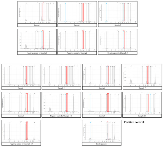 16S library for TapeStation analysis. The expected size of the target amplicon is approximately 450 bases. The red box indicates the expected target region. The target amplicon products in samples are almost invisible or smaller than those of the negative control, indicating that bacteria were not present or barely present in ascites compared to the negative control. Note that the scale of the Y-axis varies between samples.