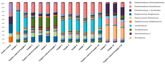 First, centrifugation was conducted, a common laboratory practice used to harvest bacteria from clinical specimens [15]. After differential centrifugation was applied to the ten ascites samples, small pellets were harvested from two malignant samples (Patients No. 1 and 2), while no pellets were visible in the rest of the samples (Figure 1). In this test, the pellet that settles after centrifugation is concentrated bacteria or mammalian cells. If the pellet is small or barely visible, this means there are very few bacteria in the sample, in this case, suggesting that the ascites has a very low biomass of bacteria. Next, prepared 16S amplicon sequencing libraries were analyzed using a bioanalyzer. The target amplicon products in the samples were almost invisible or lower than for the negative control (Figure 2), indicating that bacteria were not present or were barely present in the ascites samples compared to the negative control. The target amplicon refers to the amplification product of bacteria in the sample. Since contaminated microbial nucleic acids existed in the reagent, target amplicon products were created even in negative controls that did not contain samples. The fact that the target amplicon products of the ascites samples were smaller or less visible compared to the negative control showed that there was barely any formation of the target amplicon by sample-specific bacteria other than amplification of contaminated microbial nucleic acids in the reagent, i.e., the microbial sequences amplified from the ascites samples were reagent-derived rather than sample-specific. Finally, 16S rRNA gene sequencing was performed and analyzed. The sequencing results for the samples showed that their microbial compositions were similar to that of the negative control, and any sample-specific bacteria were isolated (Figure 3). Meanwhile, the microbial composition of the positive control mixture with six standard strains revealed that all experimental procedures appeared to be appropriate. Furthermore, through comparison with the positive control, we confirmed that 16S amplicon sequencing did not detect bacteria in the ascites samples in this study. That is to say, in the positive control, we detected bacterial sequences that were not detected in the negative control, which showed that bacteria existed specifically in the positive control, and since bacterial sequences that were not detected in the negative control were also not detected in the ascites sample, it can be said that ascites sample-specific bacteria were not detected.