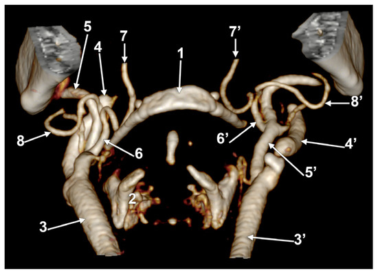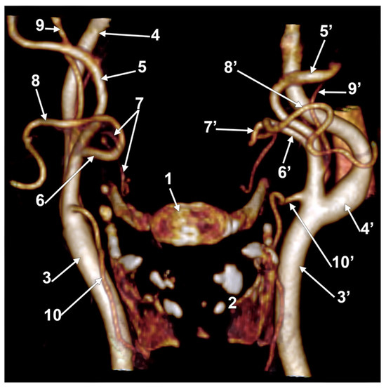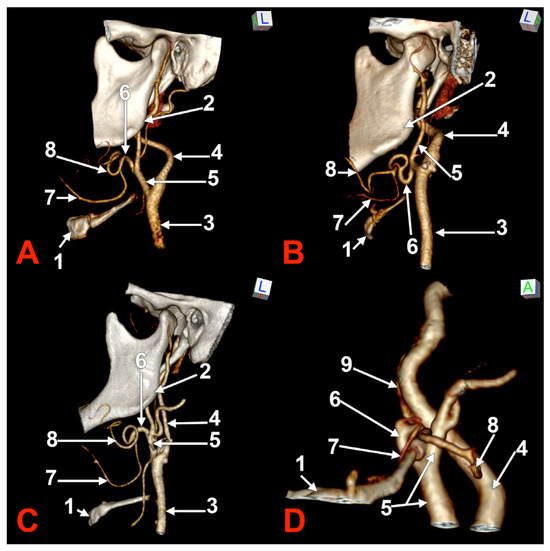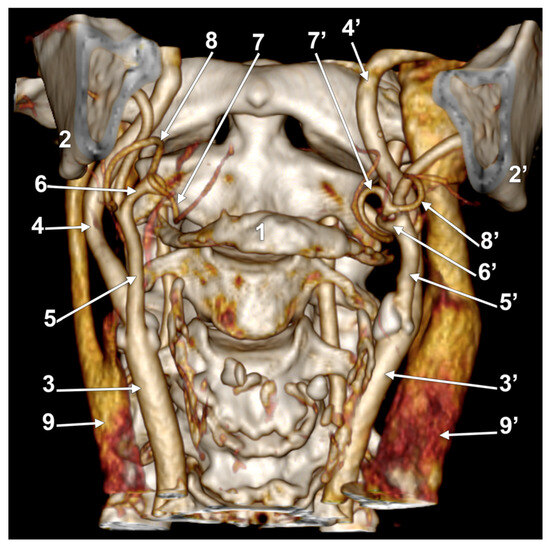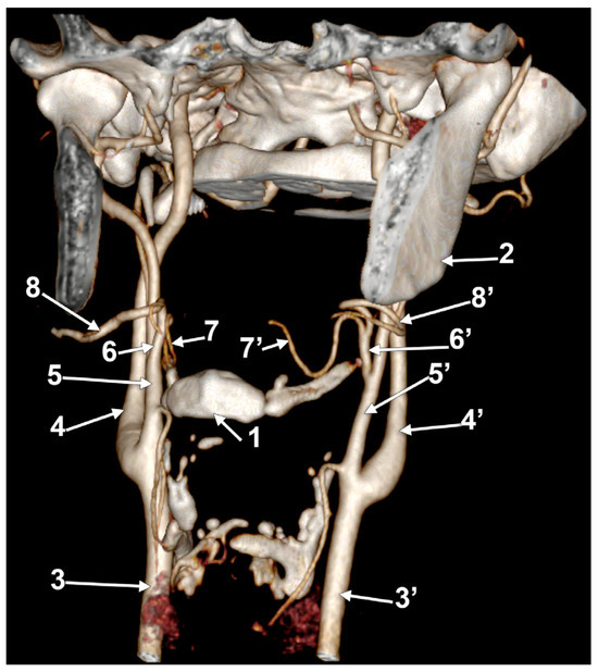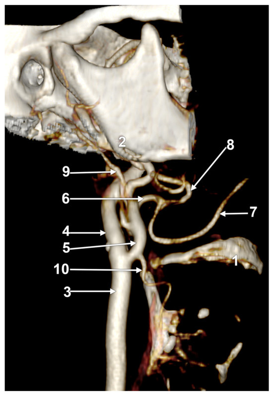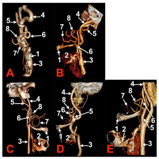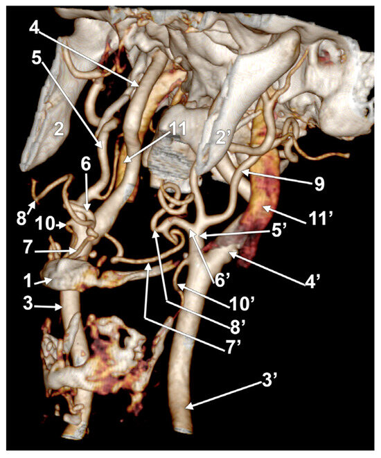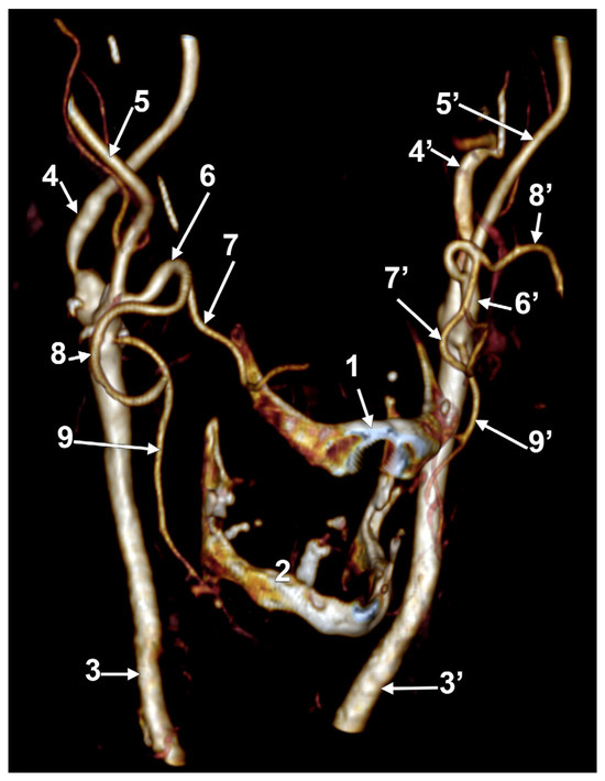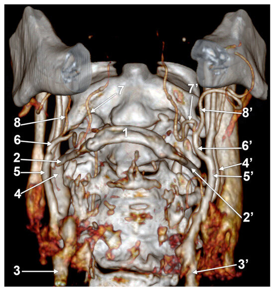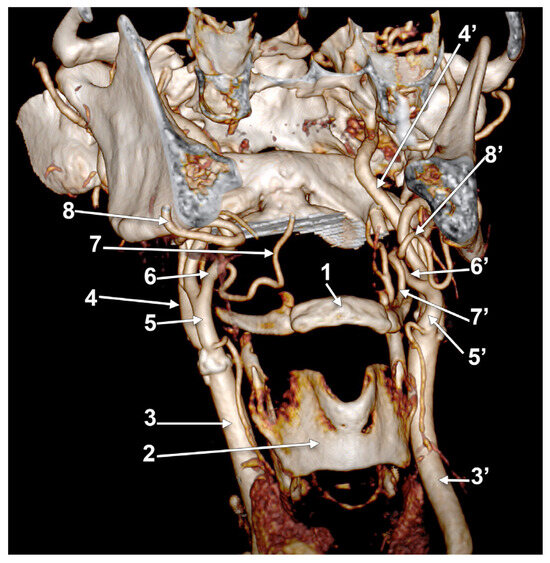 - Heltzel, S.; Jelinek, L.; Jaynes, D. Variation in the caudal branches of the external carotid artery: Comparison of sex and side. Med. Res. Arch. 2015. Available online: https://esmed.org/MRA/mra/article/view/21 (accessed on 7 December 2023). [CrossRef][Green Version]