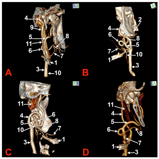 Morphological variants of the left unilateral linguofacial trunk. Computed tomography angiograms. Three-dimensional volume renderings. Anterior (A,D), antero-lateral, (B) and antero-medial (C) views. 1. hyoid body; 2. gonial angle; 3. common carotid artery; 4. internal carotid artery; 5. external carotid artery; 6. linguofacial trunk; 7. lingual artery; 8. facial artery; 9. ascending pharyngeal artery; 10. superior thyroid artery; and 11. internal jugular vein.