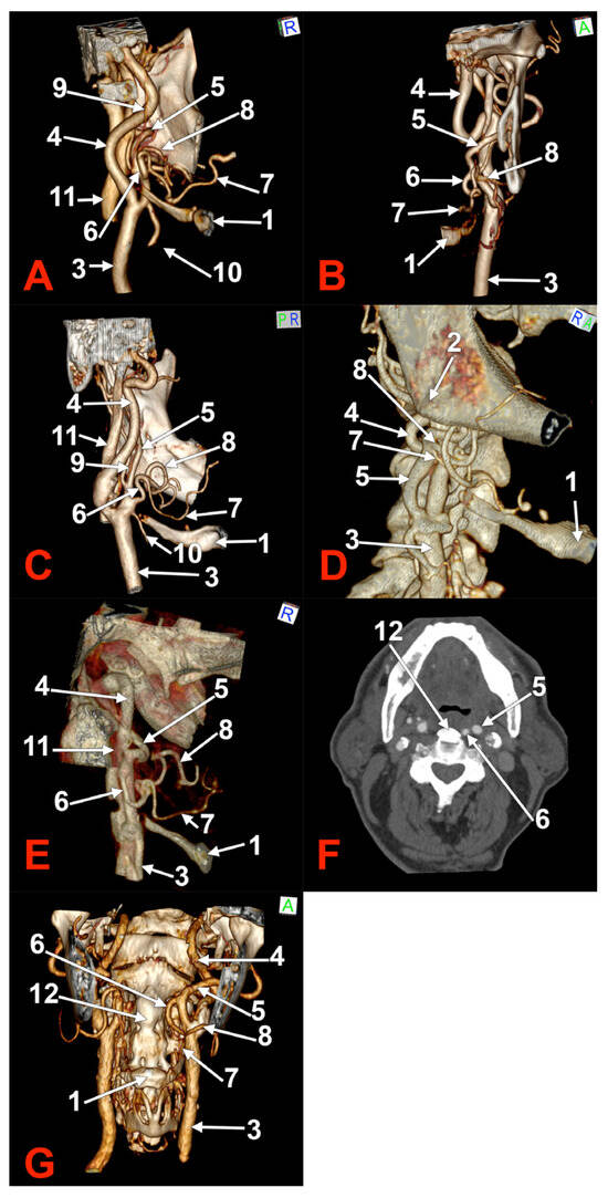Morphological variants of unilateral left linguofacial trunks. Computed tomography angiograms. Three-dimensional volume renderings. Anterior (B,C,G), right lateral (D), and medial (A,C,E) views. Axial slice (F). 1. hyoid body; 2. gonial angle; 3. common carotid artery; 4. internal carotid artery; 5. external carotid artery; 6. linguofacial trunk; 7. lingual artery; 8. facial artery; 9. ascending pharyngeal artery; 10. superior thyroid artery. 11. internal jugular vein; and 12. ossified anterior longitudinal ligament.