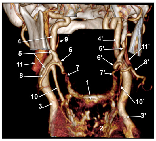 Bilateral linguofacial trunk. Computed tomography angiogram. Three-dimensional volume rendering. Anterior view. 1. hyoid body; 2. thyroid cartilage; 3, 3’. common carotid arteries; 4, 4’. internal carotid arteries; 5, 5’. external carotid arteries; 6, 6’. linguofacial trunks; 7, 7’. lingual arteries; 8, 8’. facial arteries; 9. ascending pharyngeal artery; 10, 10’. superior thyroid arteries; and 11, 11’. internal jugular veins.