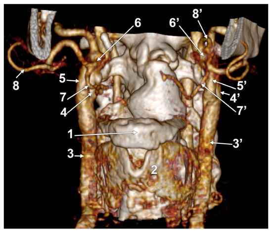 Bilateral linguofacial trunk. Computed tomography angiogram. Three-dimensional volume rendering. Left antero-lateral view. 1. hyoid body; 2. thyroid cartilage; 3, 3’. common carotid arteries; 4, 4’. internal carotid arteries; 5, 5’. external carotid arteries; 6, 6’. linguofacial trunks; 7, 7’. lingual arteries; and 8, 8’. facial arteries.