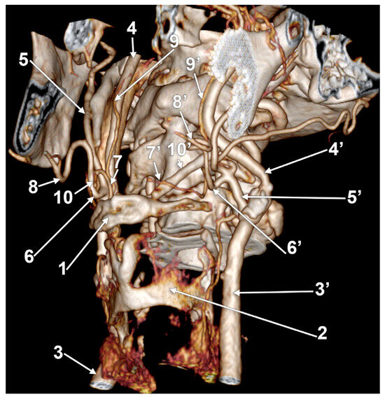 Bilateral linguofacial trunk. Computed tomography angiogram. Three-dimensional volume rendering. Left antero-lateral view. 1. hyoid body; 2. thyroid cartilage; 3, 3’. common carotid arteries; 4, 4’. internal carotid arteries; 5, 5’. external carotid arteries; 6, 6’. linguofacial trunks; 7, 7’. lingual arteries; 8, 8’. facial arteries; 9, 9’. internal jugular veins; and 10, 10’. superior thyroid arteries.
