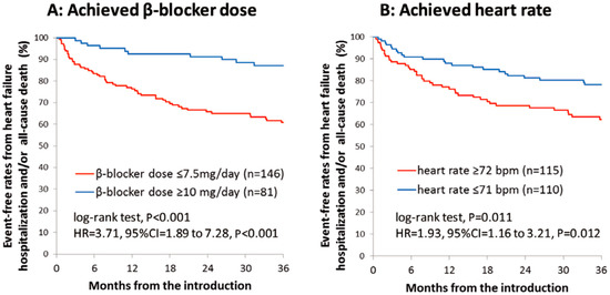 Event-free rates from heart-failure hospitalization or all-cause death stratified by the achievement of beta-blocker doses equal to or above 10 mg/day or not (A) and by the achievement of resting heart rate equal to or above 72 beats per minute (B) in a large academic center (with permission to reuse from the publisher) [16]. Patients with a lower dose of beta-blockers or those with higher heart rate had lower freedom from the composite endpoints. HR, hazard ratio; CI, confidence interval. Kaplan–Meier curves were compared by log-rank test.