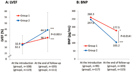 Trends of left-ventricular ejection fraction (A) and plasma B-type natriuretic peptide levels (B) in the two groups stratified by the study period with different up-titration policies (with permission to reuse from the publisher) [16]. Group 1 was defined as patients who received beta-blockers before December 2005. Group 2 was defined as patients who received beta-blockers after December 2005. Group 1 had insufficient improvement in LVEF and plasma BNP levels during the observation period compared with Group 2. † Unpaired t-test. *** p <0.001 and * p < 0.05 by paired t-test.