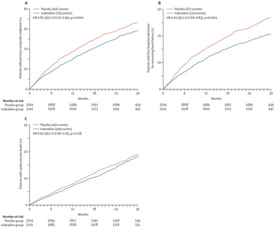 The foundation of these guidelines is rooted in the seminal SHIFT trial [8,9]. This pivotal clinical investigation encompassed patients characterized by sinus rhythm, a left-ventricular ejection fraction equal to or less than 35%, and a heart rate equal to or exceeding 70 beats per minute [19]. These individuals were randomized into two groups: one receiving ivabradine and the other a placebo. The analysis revealed a substantial reduction in the cumulative incidence of cardiovascular death or heart-failure readmission in the ivabradine group, exhibiting a noteworthy hazard ratio of 0.82 (Figure 3A–C) [8]. The beneficial effects of ivabradine were evident irrespective of the severity of heart-failure symptoms, as defined by the New York Heart Association functional class. Thus, the SHIFT trial is a cornerstone of ivabradine therapy for individuals with higher heart rate, sinus rhythm, and reduced ejection fraction.