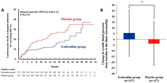Prospective randomized control trial to compare ivabradine and placebo on the cumulative incidence of cardiovascular death or heart-failure rehospitalization in the J-SHIFT trial (A). Change in systolic blood pressure from baseline to the final visit between the ivabradine group vs. the placebo group (B) (with permission to reuse from the publisher) [21]. The ivabradine group tended to have lower cumulative incidence of the composite endpoint with preserved systolic blood pressure during the observation period as compared to the placebo group. CI, confidence interval. Log-rank test was used to compare Kaplan–Meier curves. * p < 0.05 by unpaired t-test.