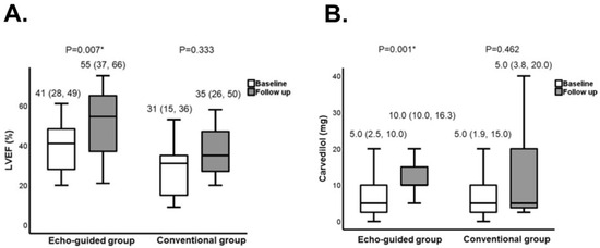 Comparison in clinical parameters between the echo-guided group and conventional group. LVEF (A) and the daily dose of carvedilol (B) were compared (reused with a permission from the publisher) [38]. Both groups received ivabradine. In an echo-guided group, the dose of ivabradine was adjusted to achieve the optimal heart rate, at which the E-wave and A-wave in the trans-mitral Doppler echocardiography stand adjacent without any overlap. In a conventional group, the dose of ivabradine was adjusted to achieve a heart rate between 50 and 60 beats per minute without using echocardiography. LVEF, left-ventricular ejection fraction. * p < 0.05 by Wilcoxon signed-rank test.
