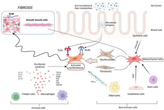 Intestinal fibrogenesis is a complex, multifactorial process affected by multiple elements, such as genetic factors, gut barrier integrity, microbiota, the immune system, or the regulation of cytokine expression (Figure 1). Two parallel processes are responsible for fibrogenesis in IBD: the expansion of smooth muscle cells and the extensive accumulation of ECM in layers of the bowel wall []. In the situation of intestinal tissue damage, the process of mesenchymal cells’ accumulation starts in order to secrete ECM components together with growth factors and repair the defect. Mesenchymal cells, characterized by a high motility and versatility, may be gained in the process of the proliferation of existing local mesenchymal cells, cell migration from adherent structures, or differentiation from other types of intestinal cells, like epithelial or endothelial []. Intestinal microorganisms and their metabolites, together with growth factors, cytokines secreted by immune and non-immune cells, or even ECM products themselves, are the main factors inducing the processes of mesenchymal cells’ activation and differentiation []. One of the potential targets of several triggering factors, especially microbial components, are toll-like receptors (TLRs), mainly TLR-4, the activity of which affects epithelial–mesenchymal transition, collagen production, or myofibroblast function []. However, in a situation of chronic, severe inflammation, like in IBD, mechanisms of tissue self-regeneration become upregulated, resulting in the accumulation of excessive amounts of ECM products, reducing the intestinal lumen in the place of previous injury, developing stenosis, and subsequently GI tract obstruction. The chronically stimulated mechanisms of tissue regeneration lead to an imbalance between the matrix metalloproteinases (MMP) and cathepsins involved in tissue degradation and the tissue inhibitors of metalloproteinases (TIMPs), impeding their activity [,]. The progression of fibrotic changes in the bowel wall can continue independently from the activity of inflammation, which seems to be only a triggering factor for the onset of fibrosis, proceeding in its next steps in a self-perpetuating manner, activated by integrin-mediated mechanisms [,].