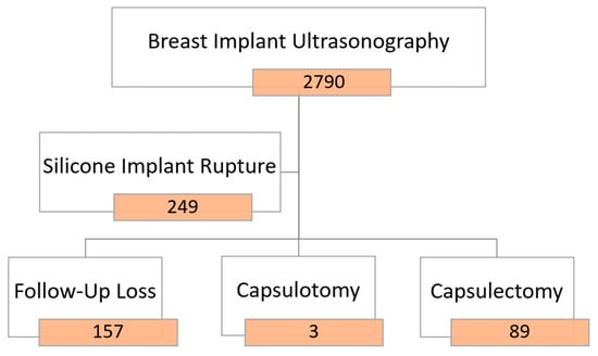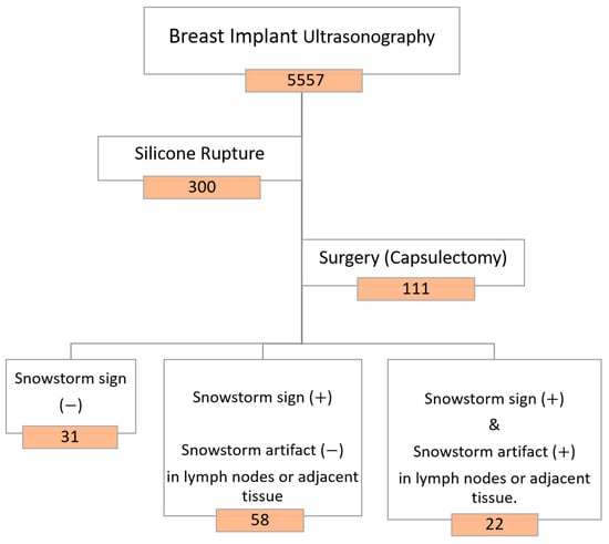 Axillary lymph nodes were thoroughly assessed during the ultrasound examinations. Nodes were categorized as either normal or containing silicone, particularly focusing on the presence of snowstorm artifacts indicative of silicone infiltration. Among the 5557 breast implants (2790 patients) screened, images from 300 breast implants (249 patients) revealed evidence of silicone breast implant ruptures. Subsequently, 89 women (111 breasts) with confirmed silicone breast implant ruptures opted for surgery, specifically undergoing capsulectomy, as illustrated in Figure 2. Regrettably, 156 patients were lost to follow-up for revisional surgery at other medical sites.