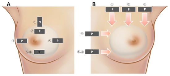 Position of breast implant ultrasonography. (A) Checkpoint for picture; (B) checkpoint for video (P is point of prove).