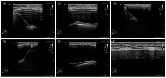 Figure 4B illustrates the optimal locations for specific video information, guiding the probe downward or horizontally toward the red arrow. Each number corresponds to assessing distinct aspects: (1) the lateral part of the breast implant and periprosthetic space, (2) the central part of the breast implant and the periprosthetic space, (3) the medial part of the breast implant and the periprosthetic space, (4) the upper part of the breast implant and the periprosthetic space, (5) the lower part of the breast implant and the periprosthetic space, and (6) the shell surface topography of the breast implant. Examples of ultrasonographic images strategically positioned for the optimal assessment of breast implant integrity are depicted in Figure 5.