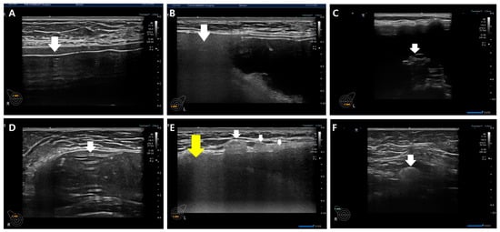 Various diagnostic clues in silicone breast implant rupture. (A) Free silicone (indicated by a white arrow), (B) snowstorm sign (indicated by a white arrow), (C) gel fracture sign (indicated by a white arrow), (D) stepladder sign (indicated by a white arrow), (E) adjacent silicone migration (indicated by a white arrow) with snowstorm sign (indicated by a yellow arrow), and (F) silicone migration to regional lymph nodes (indicated by a white arrow).